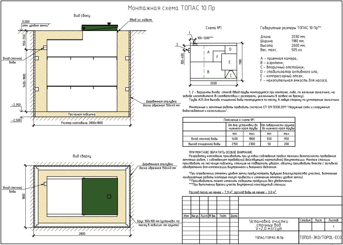 ТОПАС 10 ПР — это аэрационная установка для очистки бытовых стоков в условиях отсутствия централизованной канализации. Оборудование обеспечивает до 98 % очистки бытовых отходов, что соответствует требованиям СанПиН. Принцип работы системы основан на технологии глубокой биологической очистки. В результате получается безопасная для окружающей среды и людей вода, которую можно использовать для полива газонов или деревьев. Отработанный ил удаляется из установки каждые 3-4 месяца с помощью насоса, после чего помещается в компостную яму и, пройдя процесс разложения, используется как удобрение.