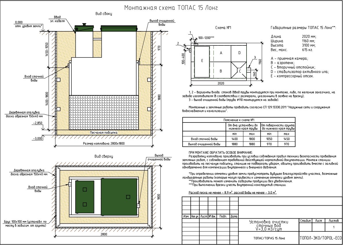 ТОПАС 15 Long — это аэрационная установка для очистки бытовых стоков в условиях отсутствия централизованной канализации. Оборудование обеспечивает до 98 % очистки бытовых отходов, что соответствует требованиям СанПиН. Принцип работы системы основан на технологии глубокой биологической очистки. В результате получается безопасная для окружающей среды и людей вода, которую можно использовать для полива газонов или деревьев. Отработанный ил удаляется из установки каждые 3-4 месяца с помощью насоса, после чего помещается в компостную яму и, пройдя процесс разложения, используется как удобрение.