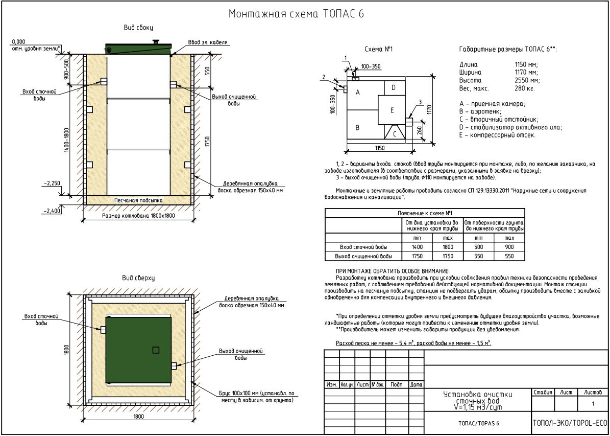 Если в вашем загородном доме, коттедже или на даче проживают от одного до четырех человек, и у вас есть душевая кабина, унитаз и две раковины, то установка ТОПАС 6 станет отличным решением. Эта автономная канализационная система предназначена для круглогодичного или сезонного использования. Максимальный объем стоков, который она способна принять за короткий промежуток времени, составляет 175 литров. Степень очистки сточных вод достигает 98%.