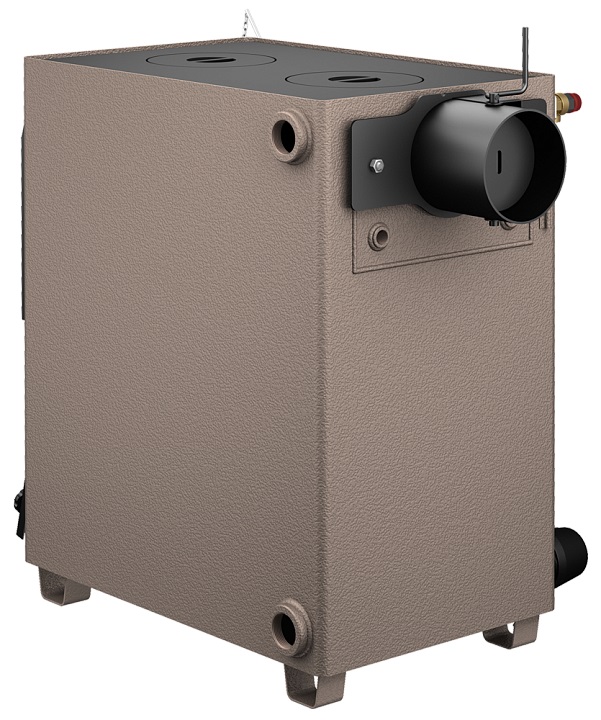 Конструкция модели включает сварной корпус из стали толщиной 3 мм, что обеспечивает надежность и долговечность. В котле предусмотрена варочная плита с двумя конфорками, а также возможность установки блока ТЭНов для работы на электричестве.